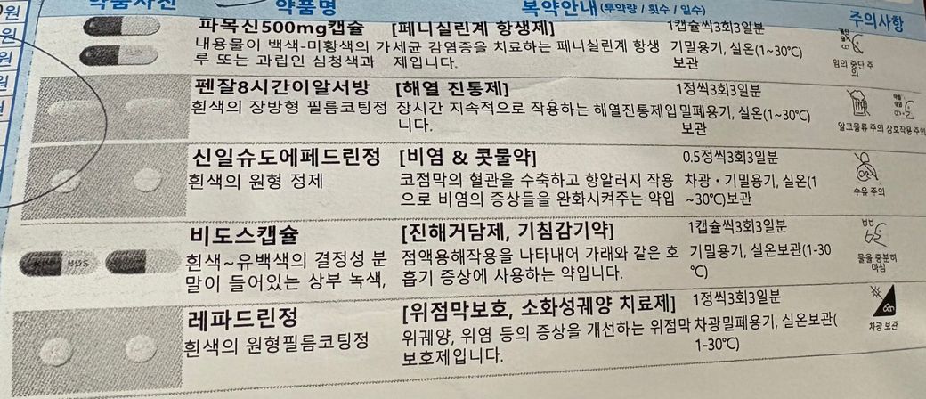처방받으신 감기약인 파목신500mg캡슐 / 펜잘8시간이알서방정 / 신일슈도에페드린정 / 비도스캡슐 / 레파드린정은 소염진통제 또는 생리통약으로 사용되는 이지엔6 시리즈 약들(이지엔6 에이스 제외)과 성분이 겹치지 않으며 특별히 주의해야할 상호작용이 없습니다. 따라서 함께 복용하실 수 있으며, 동시에 복용하셔도 괜찮습니다.