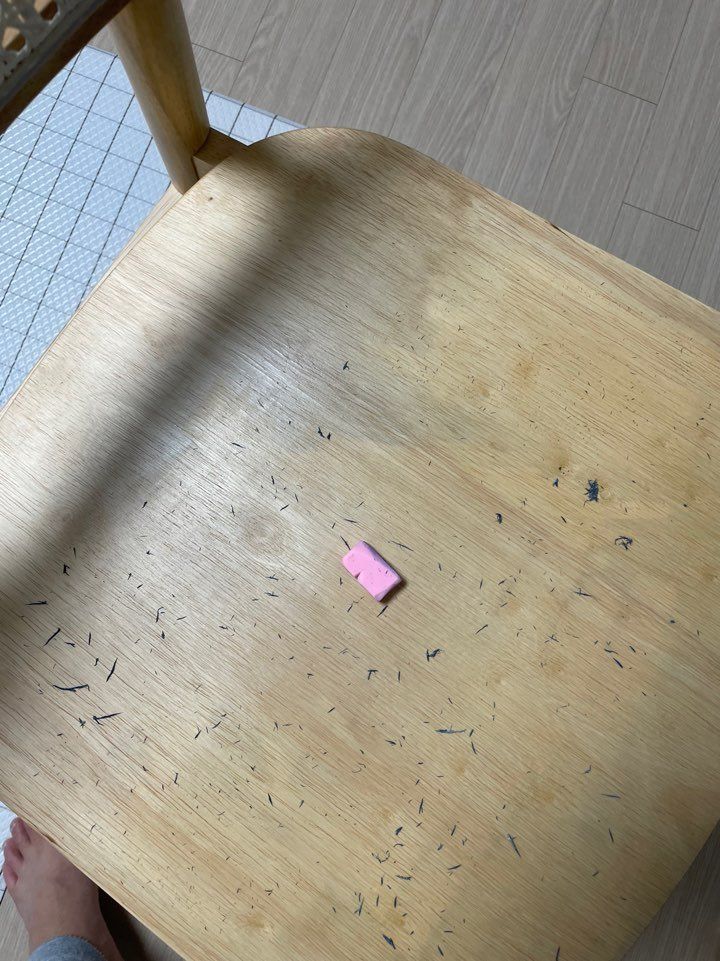 염색된 의자 사진 같이 첨부합니다. 엉덩이 받침부분은 지우개로 지울 수 있으나 등받이 부분은 지우기가 불가능합니다.