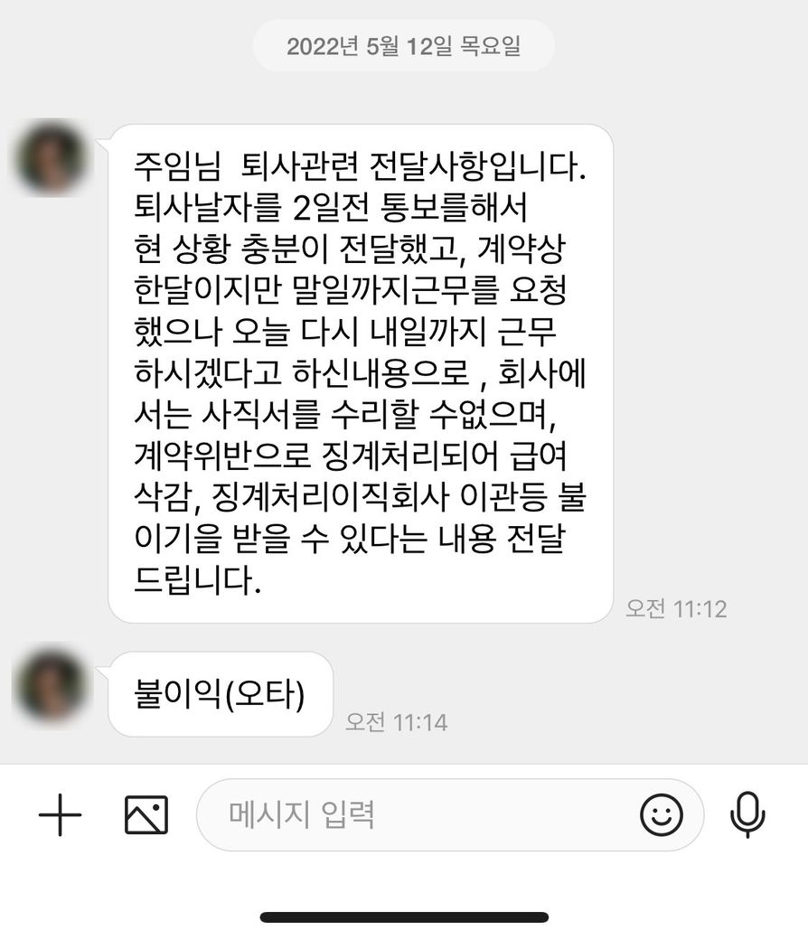 이에 저는 그 내용을 읽고 답장하지 않았고 바로 다음날인 5/13(금)일에 사직서를 제출하라고 해서 사직서를 제출하고