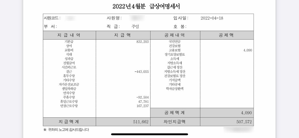 그런데 급여명세서를 받아보니 빠지는 금액이 너무 많은 것 같아 전화를 했고 혹시 삭감이 적용된 금액이냐하니