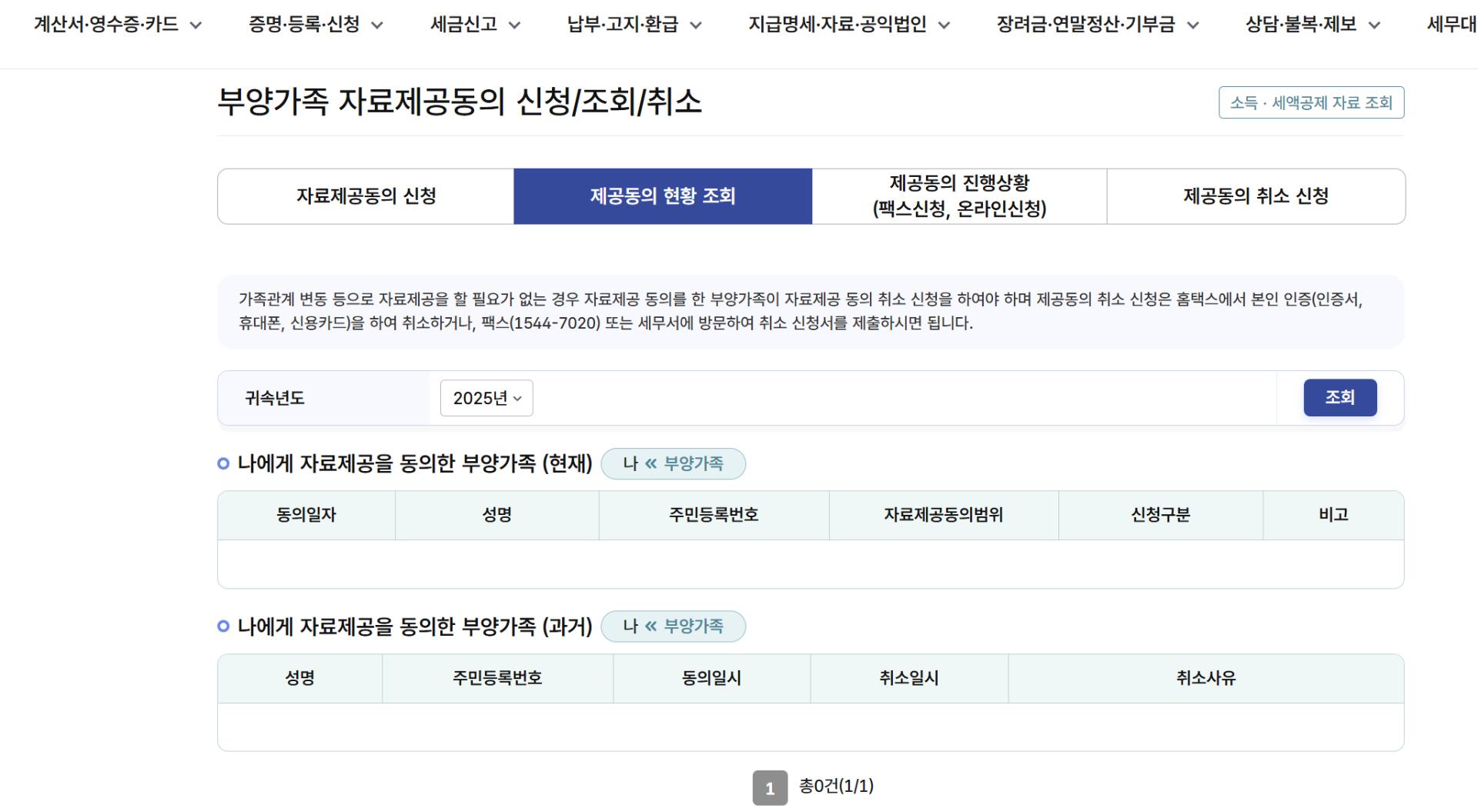 오른쪽상단 전체메뉴 - [장려금·연말정산·전자기부금]-[연말정산간소화]-[부양가족 자료제공동의 신청/조회/취소]-[제공동의현황조회]-[제공동의현황조회]