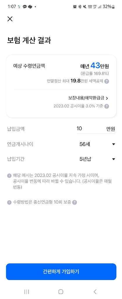 위 캡쳐 내용으로 작성자님 말씀하신대로 매년43만원 10년간보증하고 종신까지 받을수있습니다. 다만 2023년2월 3% 공시이율적용시 이고 공시이율변동시 매년 받는43만원이라는 금액도 변동됩니다