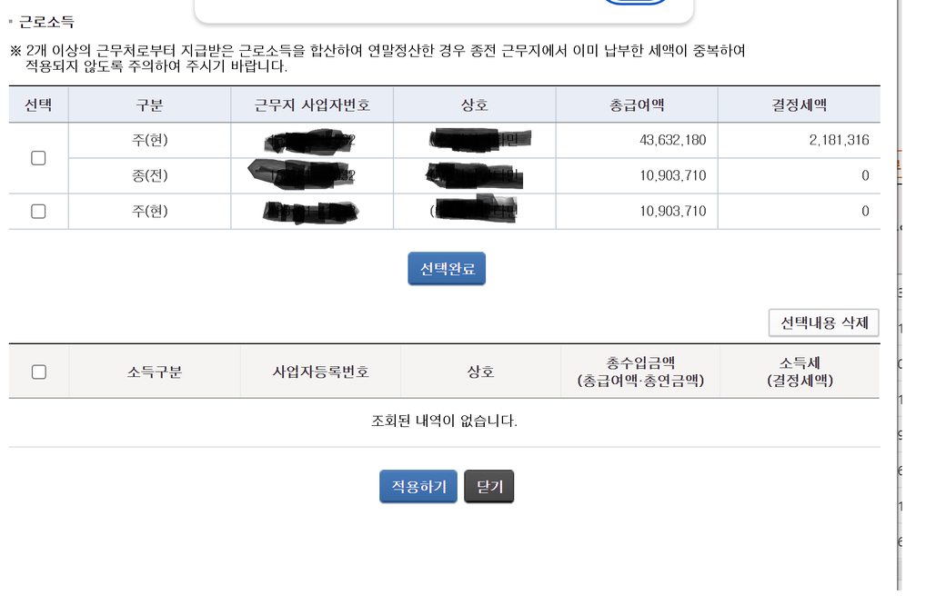위에 사업장은 모두 같은 사업장이고 어머니가 60세 이후 1년 계약직으로 계속 일해오고 계서서 이렇게 뜨는거 같은데 보시면 첫번째 선택란 종(전)과 두번째 선택란 주(현)의 총급여액이 똑같습니다.