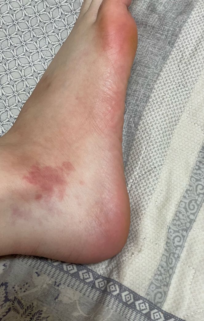 현재 올려주신 사진만으로 보았을 때는 명확한 질환명을 진단하기는 어려우나 오랜 시간 있었다면 양말이나 압력으로 인한 만성 피부염 증상일 가능성이 있겠으며 이외에도 정맥순환 문제로 인한 울혈 증상 등을 의심해 봐야할 수 있습니다.