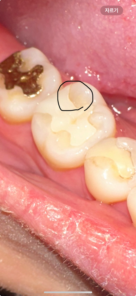 사진을 찍어보는 것이 정확하겠으나 충치의 가능성도 있어보입니다. 시간될 때 치과가보시면 되겠습니다.