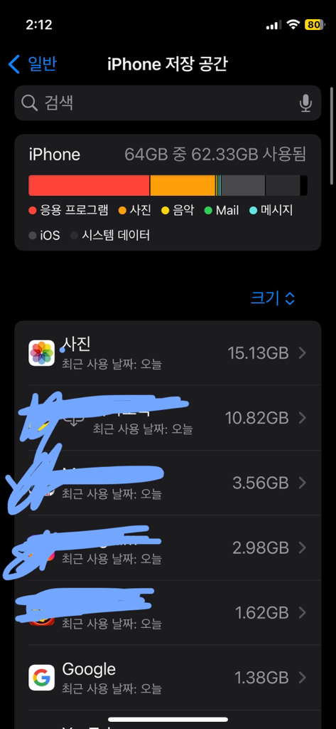 현재 사용하시는 64기가는 지금의 생활 환경과는 떨어져있는 용량입니다. 사진 및 동영상 고화질로 용량을 많이 차지하고 있어요. 특히 카카오톡으로 전송 및 다운 받은 사진과 동영상 그리고 톡 대화들이 저장되어 많은 용량을 차지합니다. 사진과 동영상은 클라우드에 저장하시고 카카오톡 데이터 정리하시면 용량이 확보 될꺼에요~ 과거 자료가 다 남아있어 용량을 많이 차지하더라구요.