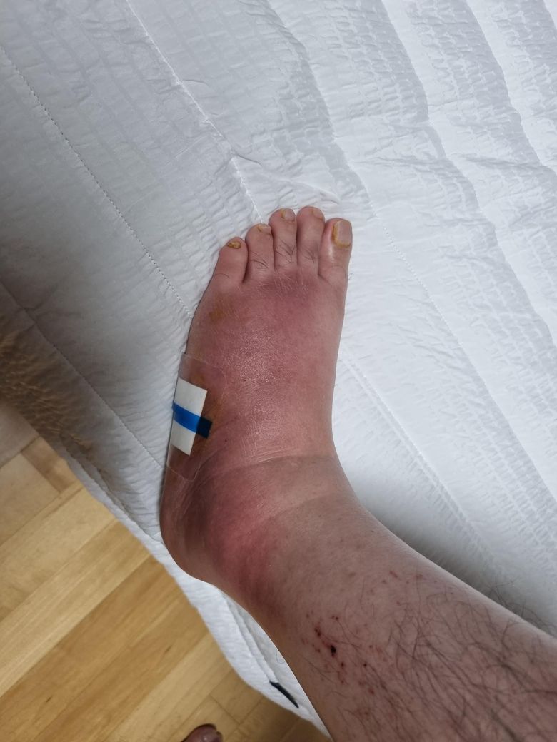 진료 전까지 체중 부하를 피하고 다리 밑에 담요를 말아 올려 놓고 휴식을 취하기 바랍니다