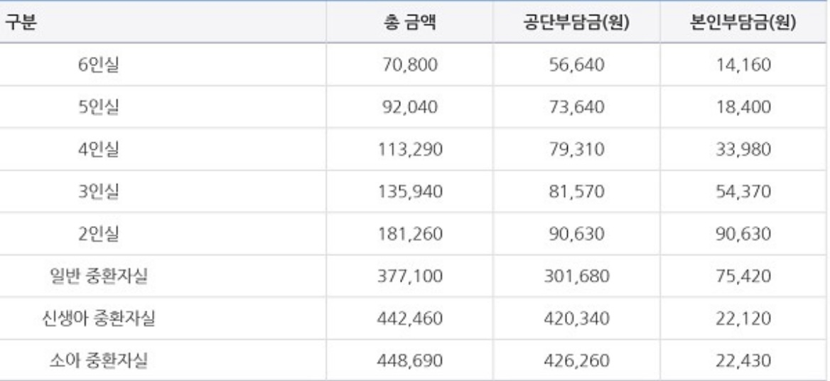 병동 인원수 호실에 따라서 상당히 많이 차이납니다. 어느정도냐고 하신다면 6일실과 2인실의 보험전 가격은 2.5배정도 차이가 나지만 보험이 적용되는 금액으로 비교하면 약 6배정도 차이가 발생합니다. 자세한건 아래 사진을 참고하시면 됩니다.