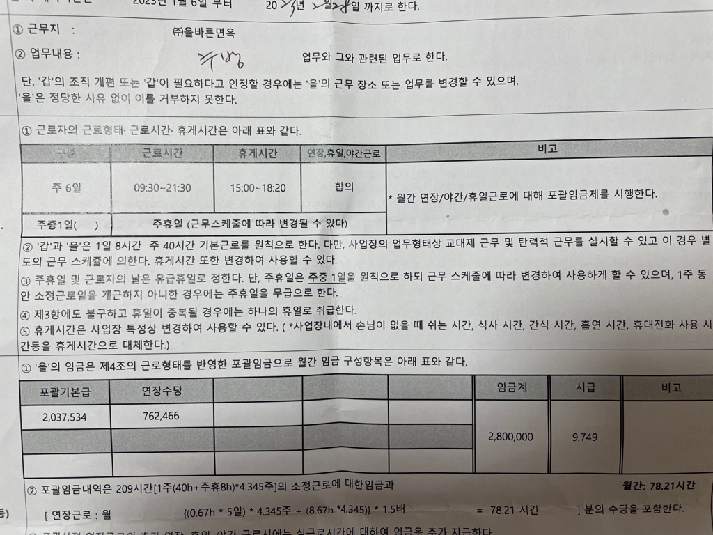 근로계약서을 작성하였는데 입사전 휴게시간과 급여는 총 2시간, 280만원 이었고 근로계약서를 작성 할 시에는 근무시간 09:30 - 21:30 중 휴게시간이 15:00 - 18:20 으로 되어 있었습니다.