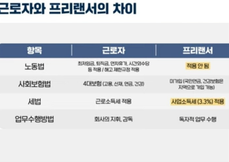 4대보험 미가입, 3.3% 공제는 위법입니다. 그러나 그와 별개로 다른 노동법은 모두 동일하게 적용해야 합니다.