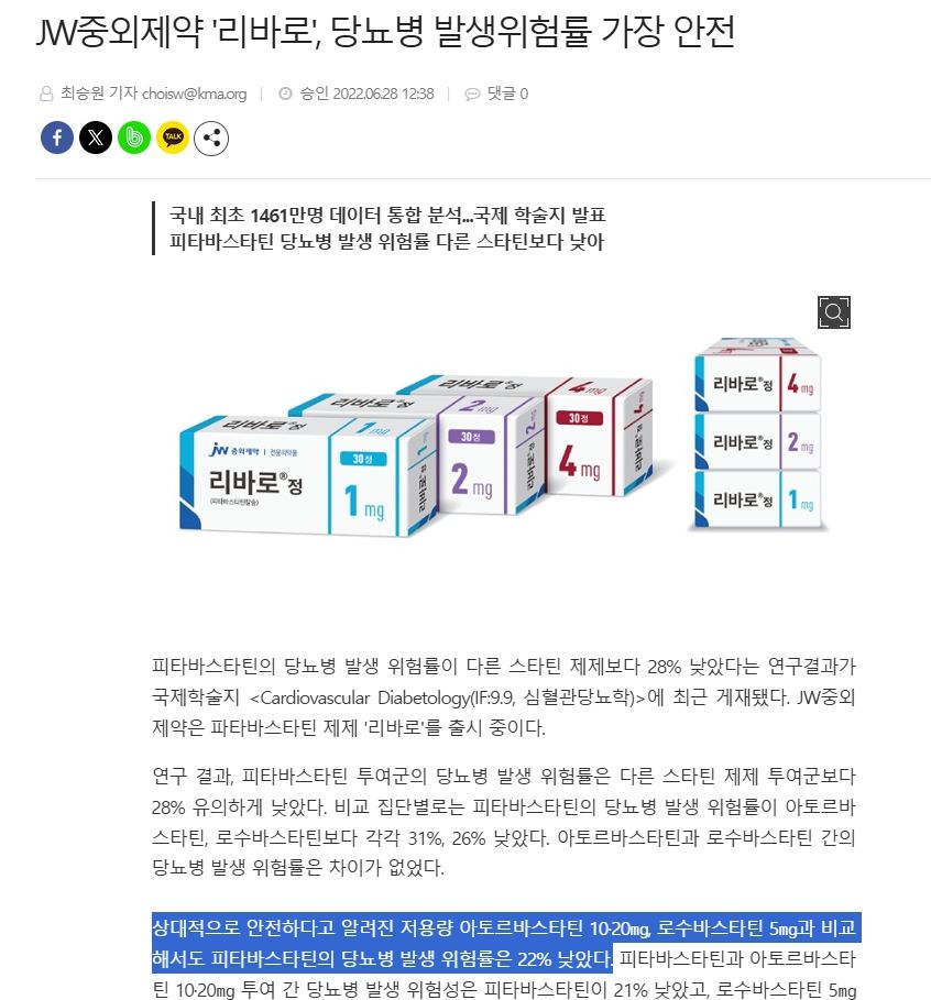 연구결과에서 피타바바스타틴 계열이 LDL 효과나 안정성이 유리하다고 하는데