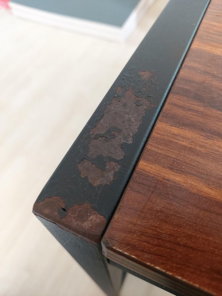 책상 다리 틀이 녹슬어서 껍데기가 벗겨져요. 보기에도 거슬리는게 신경쓰일 것 같아요. 일반인이 손쉽게 해결할 수 없을까요? 도와주세요.
