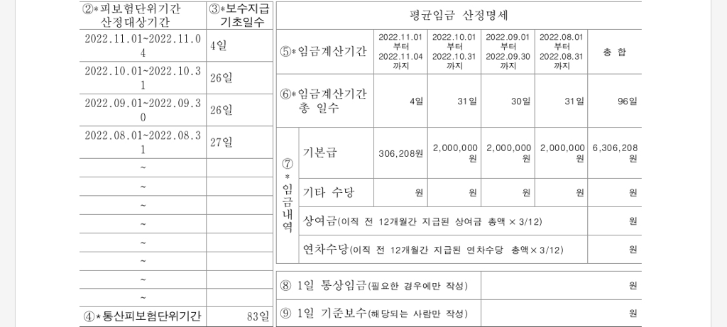 11월 4일까지 근무한 경우라면 평균임금 산정기간은 8월 5일부터 11월 4일까지입니다.