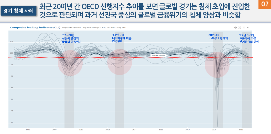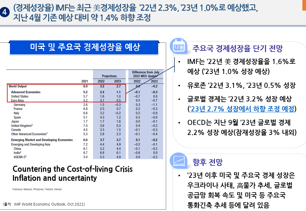 해당 링크 내에 관련 보고서가 있어 다운로드 가능합니다. 2023년 미국 경제는 잠재성장률인 2~3% 보다 낮은 1~2%대 성장율을 보이며 물가 상승률 등을 고려했을 때 역성장 가능성이 있고 유럽은 거의 성장이 멈추게 됩니다.