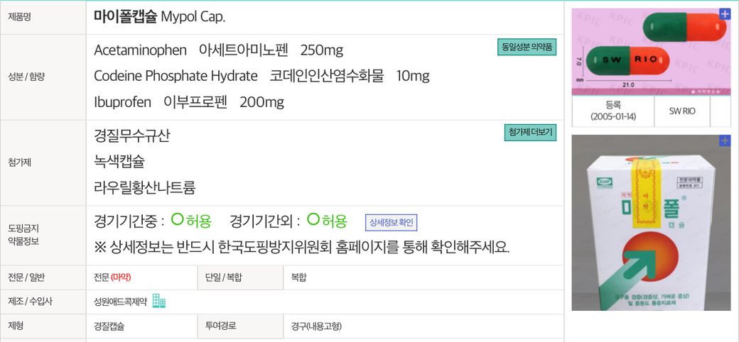 헌데 제가 진통제가 겹친다는걸 생각 못하고 처방약을 복용하면서 마이폴 캡슐도 같이 한 캡슐씩 복용했는데요. 몸에 문제가 있을까요??? 하루 두번 이틀정도 복용했는데 검사를 받아봐야하는지 아니면 허용치인지 궁금합니다