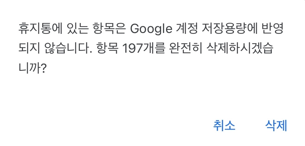 안녕하세요. 구글 포토어플에서 저용량 15기가로 백업이용하고 있는데, 용량이 거의 다 차서 삭제할 것 정해서 휴지통에 넣고, 그대로 영구삭제를 하려고 봤더니 이런 창이 뜨더라고요. 이게 휴지통에 있는 사진들을 삭제해도 저장용량에 변화가 없다는 말인가요..? 실제로 몇백장을 영구삭제했응 때에도 용량 변화가 없더라고요... 용량 확보 다른 분들은 어떻게 하시는지 궁금합니다..