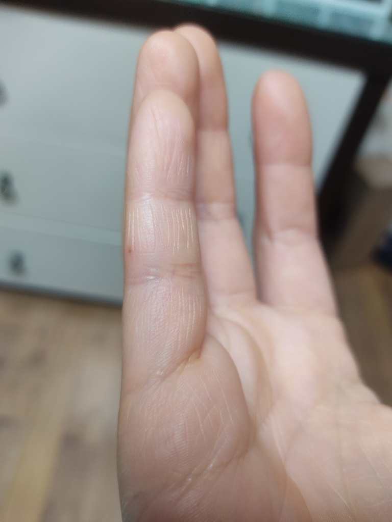 아프다면 한포진일 가능성은 떨어집니다. 피부 발진이 1개 정도만 있어서 정확한 판단은 어렵네요.