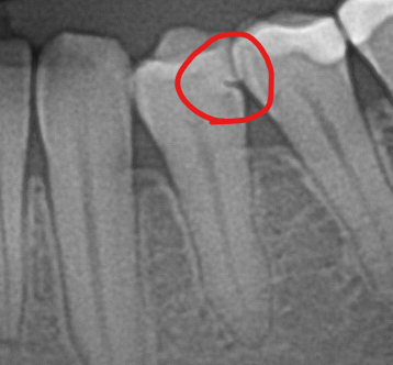 치료한 부위에서 치료한 재료와 자연치와에 사이에 틈이 있는 것으로 보이거나 아니면 x-ray에서 음영의 차이로 보이는 것일 수 있습니다. 찍는 각도에 따라 틈이 다르게 보일 수 있습니다. 치과에서 상의하는 것이 좋습니다.