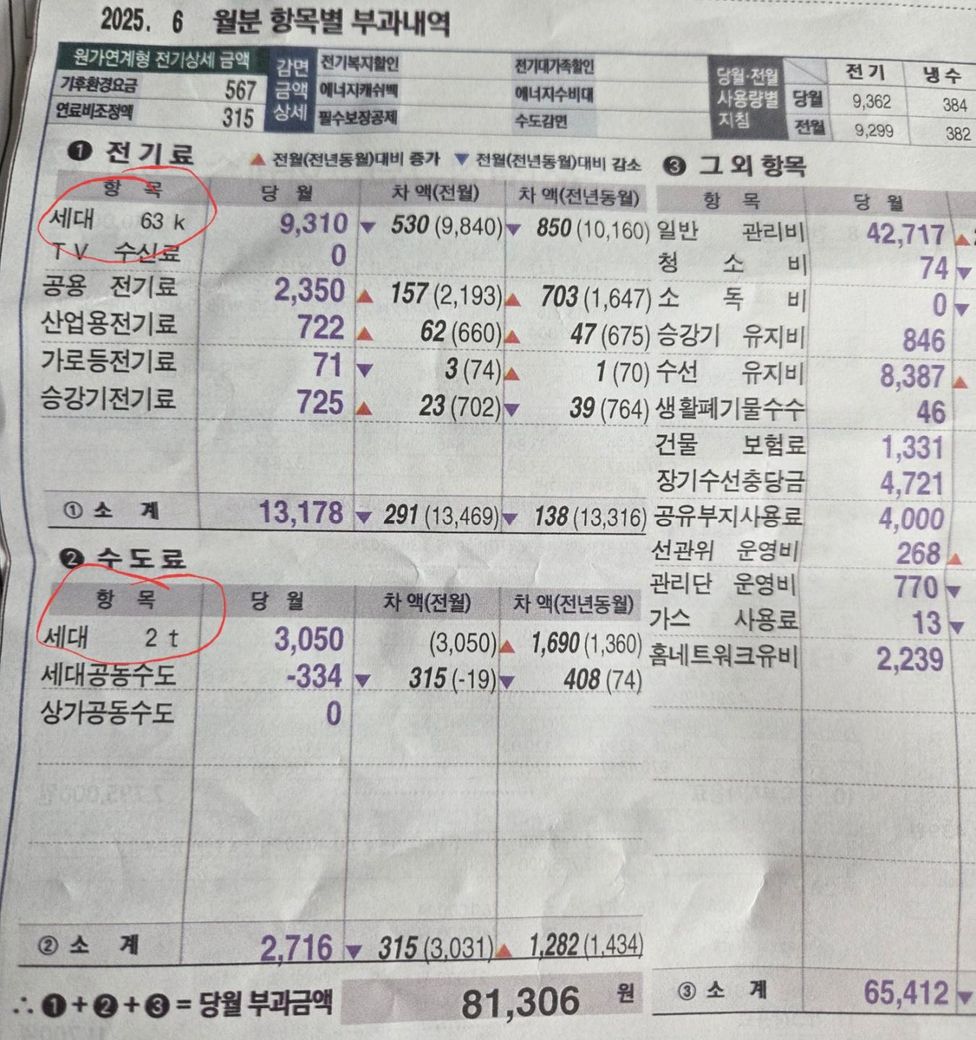 네 맞습니다. 세대가 쓴 전기사용량이 63k 그리고 수도사용량이 2t 지난 한달간 세대가 사용한 전기세와 수도료가 관비에 포함이 되어져 있습니다.