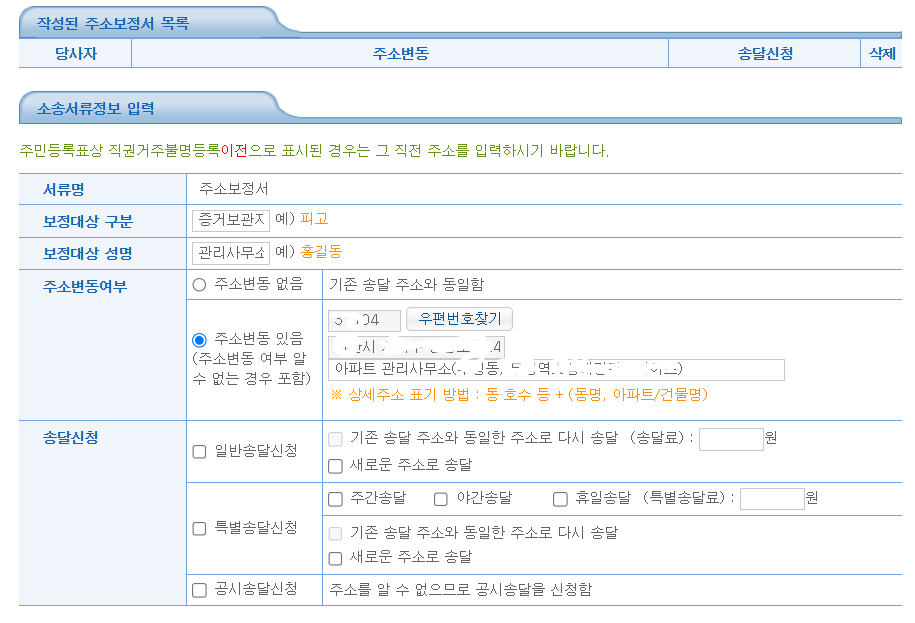 주소 보정서의 경우 이런식으로 신청하면 되는건지 여쭤보고 싶고 만약 답변서를 내야한다면 이런식으로 내면 되는건지 여쭤보고싶습니다.