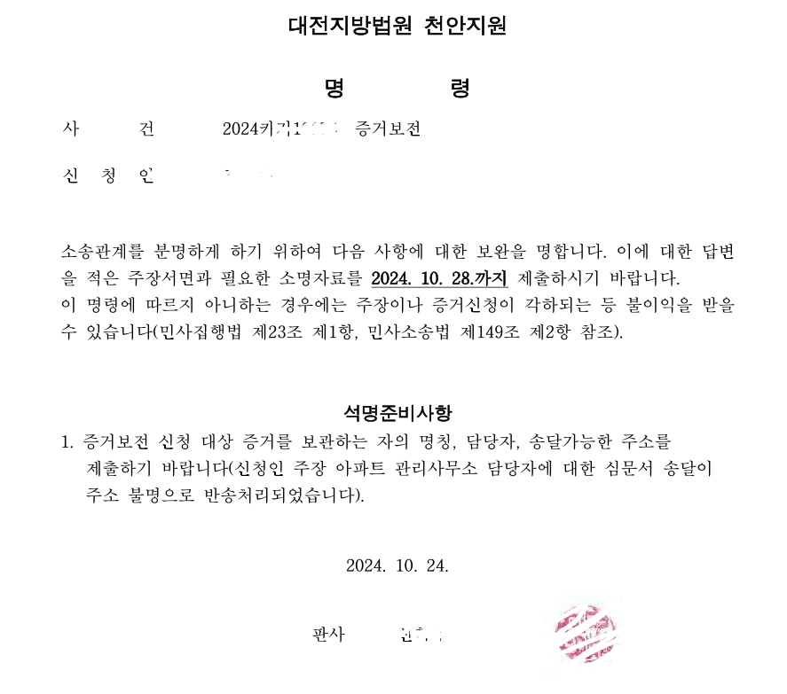 상간소송 중 상간녀 아파트 cctv와 차량입출입 기록을 증거보전신청했는데, 법원에서 석명준비명령이 왔습니다.