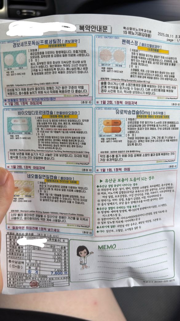 제가 급성 방광염에 걸려서 약국에서 받아온 약들입니다. 현재 저는 피임 목적으로 머시론 피임약을 13팩째 복용중입니다.
