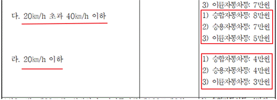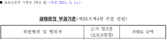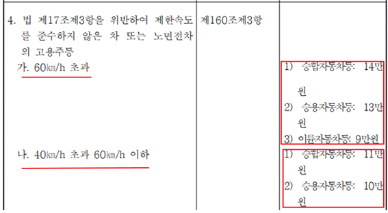 기준 속도를 초과할 경우 초과되는 속도에 따라 부과되는 과태료의 액수가 달라집니다. 아래 규정 및 별표를 참조하시기 바랍니다.