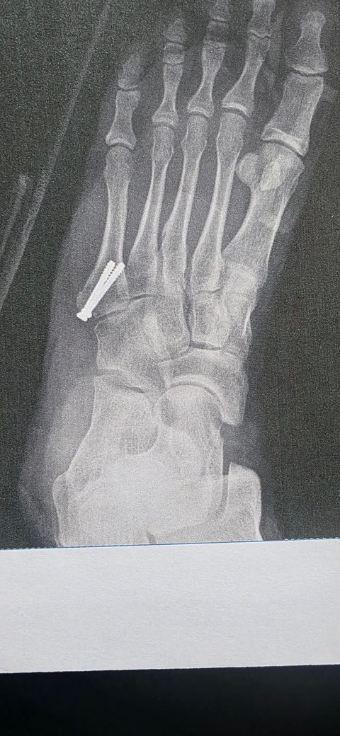 현재 통증이나 이물감이 전혀 없다면 핀(나사) 제거는 필수가 아닙니다. 중족골 고정 나사는 무증상인 경우 그대로 두는 경우가 많습니다.