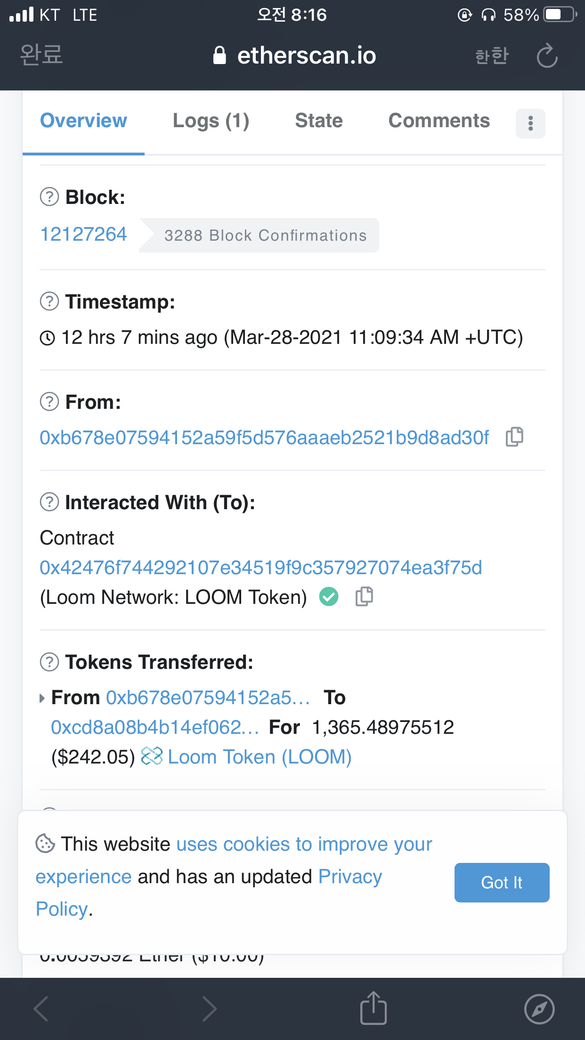 첨부해주신 스크린샷을 보면 해당 주소로 올바르게 이체가 되었습니다. 따라서 주소에는 올바르게 들어있다고 보여집니다.