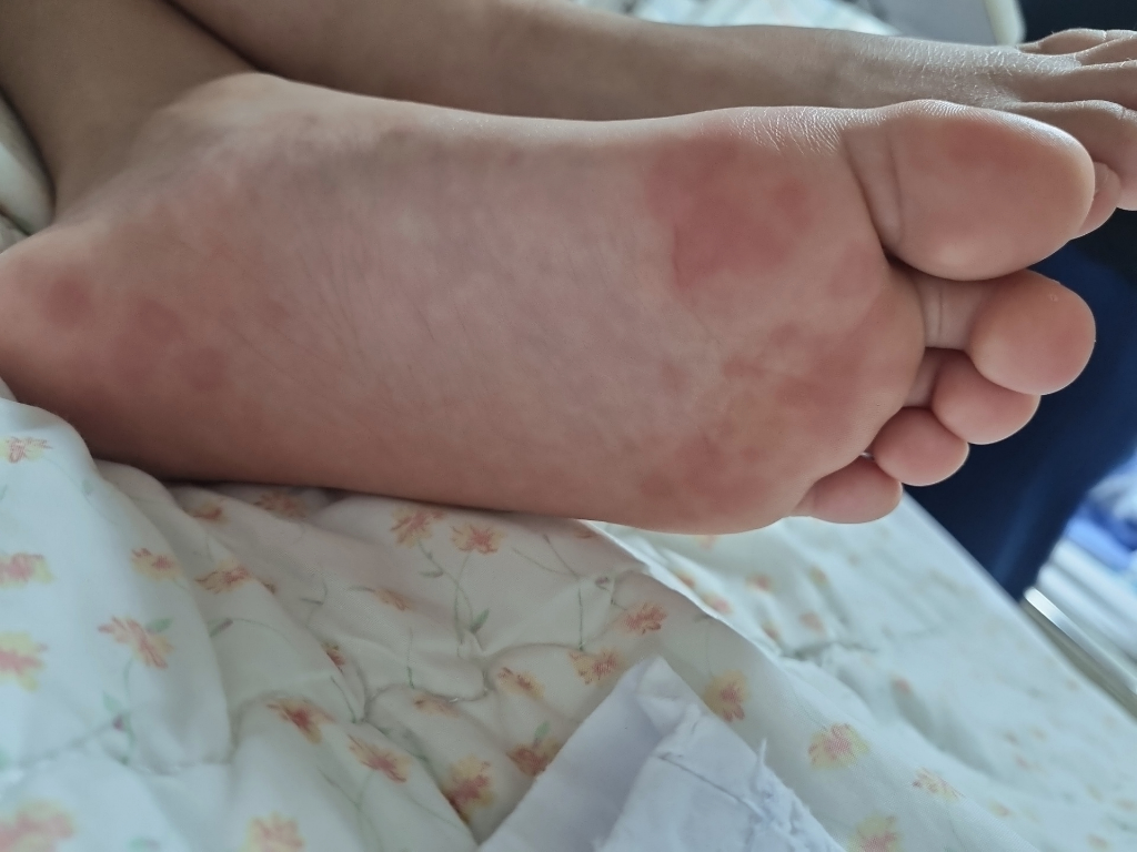병변의 모양새로 보아 두드러기가 가장 의심됩니다. 수술 후 나타난 반응이며 현재 입원중이시라면 주치의에게 증상을 알려보시기 바랍니다.