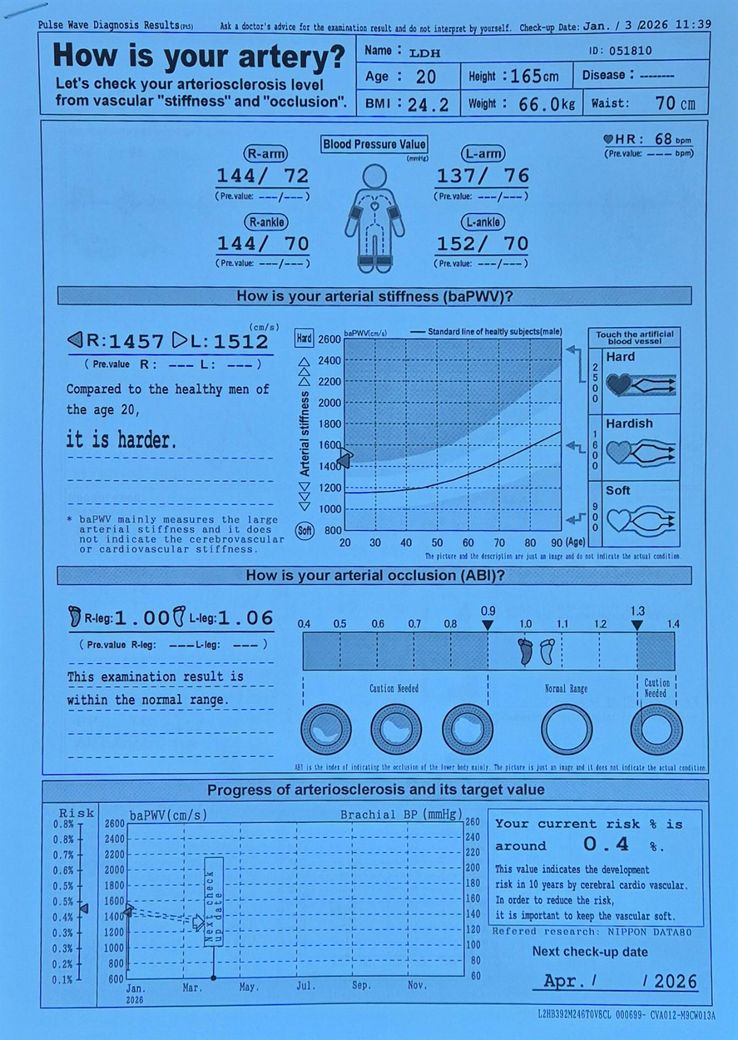 동맥경화도에 대해 질문드립니다. 제가 현재 20살인데 왼팔 오른팔 혈압차이가 20정도가 나서 abi검사를 했는데 bapwv가 1400대 1500대가 나와서 걱정이 됩니다. 지금 스트레스를 많이 받는 상황이라서 혈압이 높은거 같은데 여러가지 궁금한게 있습니다.