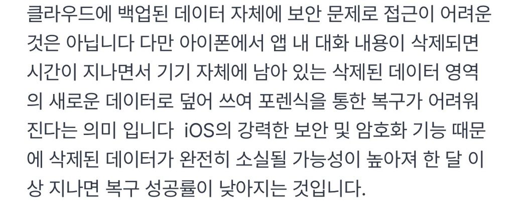 백업이 존재하더라고 라인 앱 내에서 대화가 삭제된 후 한달 이상 지나며 아이폰 자체에 남은 삭제 데이터는 iOS의 보안과 암호화로 인해 폰렌식 복구가 매우 힘듭니다 클라우드 백업은 사용자 인증 없이는 접근이 어려우며 기기 내부에서도 덮어 쓰기가 이뤄지면 흔적이 남지 않아 백업이 있어도 포렌식 도구만으로는 실직적으로 복원이 어렵습니다