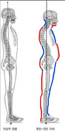 사실 목의 아랫부위가 앞으로 굽어진 이유는 흉추가 앞으로 기울어져서 그런겁니다. 정상적인 흉추도 후만이라고 해서 흉추와 경추가 만나는 부위가 앞으로 기울어져있기는 하지만 그 정도가 너무 과한거죠.