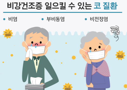 비강 건조가 지속되시는 경우 비염, 부비동염, 비전정염같은 질환에 의한 증상이 아닌지 이비인후과 진료를 한번 받아보시는게 적절하겠습니다.