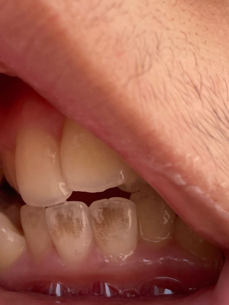니코틴 착색의 양상으로 보입니다 일반 칫솔질로는 제거 안되고요 스케일링 받아보시기 바랍니다