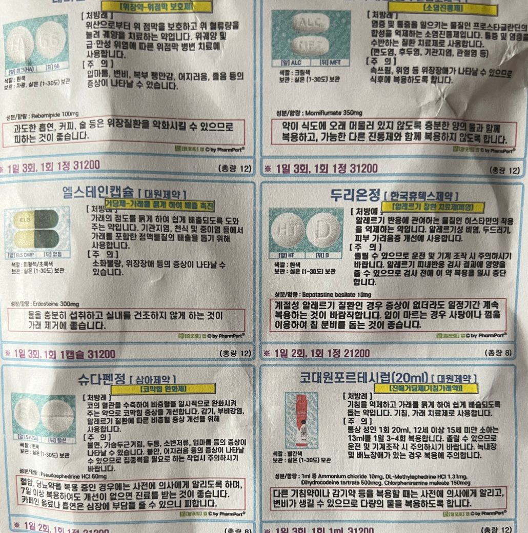 처방받으신 감기약 중에 오른쪽 위에 있는 약은 이지엔6이브와 같은 계열인 소염진통제에요.