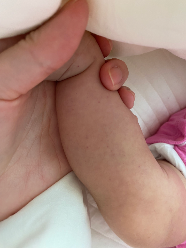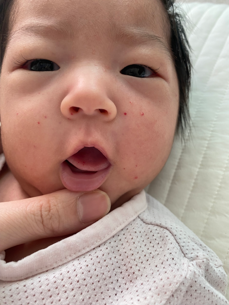 2개월 아기 어제 갑자기 손 발 다리쪽에 빨갛고 살짝 거뭇한 점들이 몇개씩 올라와있었는데 오늘 아침되니 얼굴에 빨간 점들이 생겼어요 ㅠㅠ 혓바닥까지생겼어요
