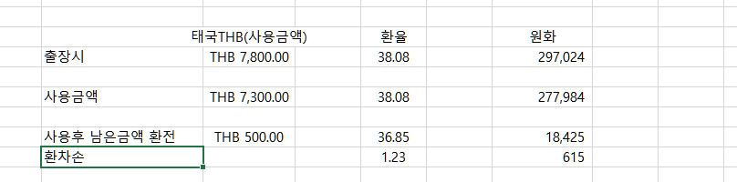 사용7300바트를 38.08환율로 일괄반영하면 사용하고 남은금액