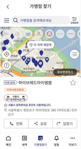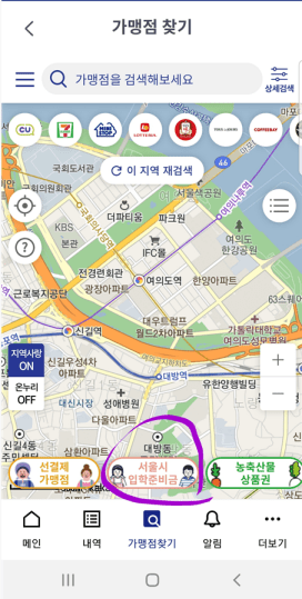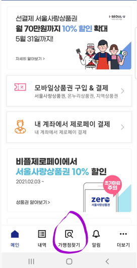 1. 첫 화면 하단 중앙에 [가맹점 찾기]를 클릭합니다.