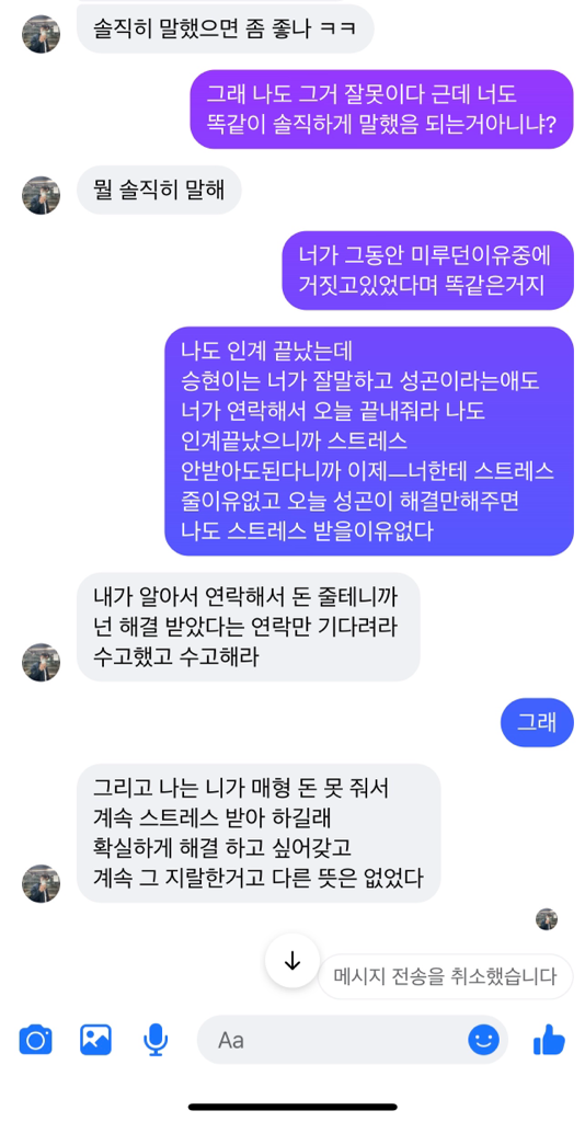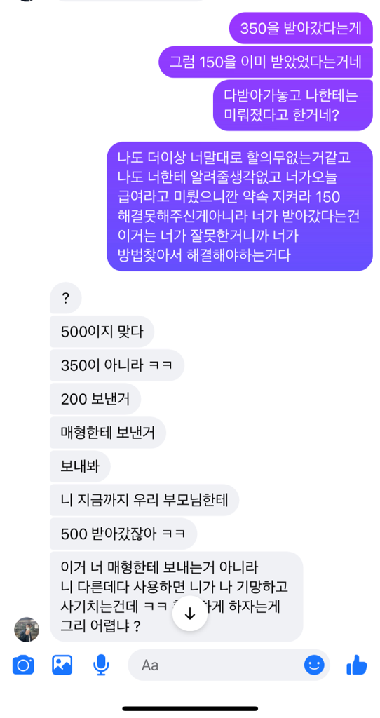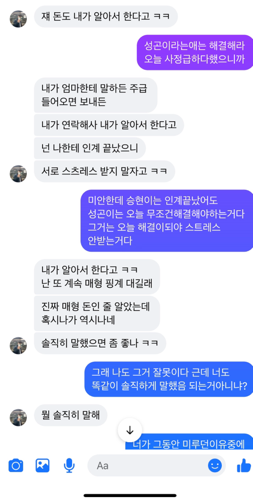 금전적인 관계를 끝내지못한게 일년가량 되어가는데 하도갚지않아서 매형에게 빌린돈을 해결해야한다고 거짓말을 해가며 돈을 조금씩 받아냈는데 어느정도 해결을하고 나머지금액을 이주라는 기간에 걸쳐서 계속 아버님이 해결해준다했다 주급이다 친구에게 돈을 받아야 돈을 갚을수있다는등 약속을 미루다가 17일날 급여날이라고 해결한다고 하더니 갑자기 사진상의 대화처럼 물어보더니 해결을 해주지않습니다 그리고 매형돈이라고 거짓말을했다고 사기기망이라고 저에게 해결해줄수없다하는데 돈을 받기위해 다른지인의 돈이라고 해결해달라도 하는게 사기기망에 속하는지 궁금해서 여쭤봅니다