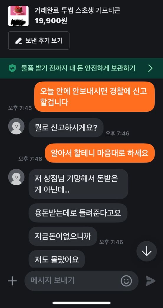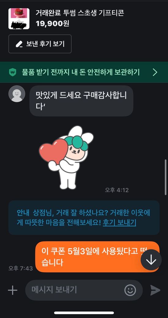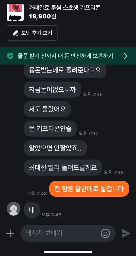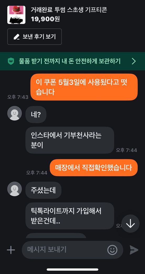 그런데 사용하려고 보니 해당 기프티콘은 이미 5월 3일에 사용된 상태였고, 저는 6월 21일에 거래를 했습니다.