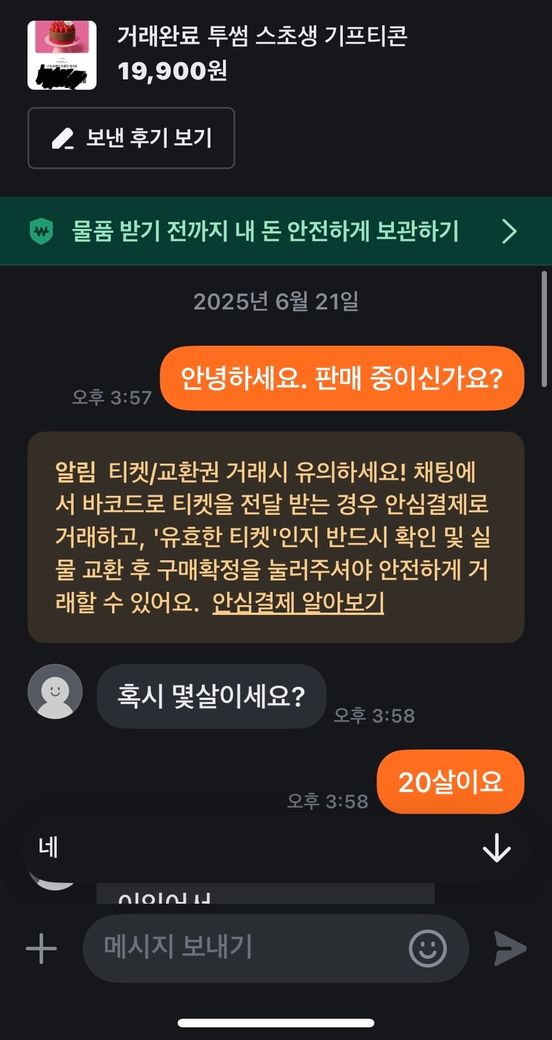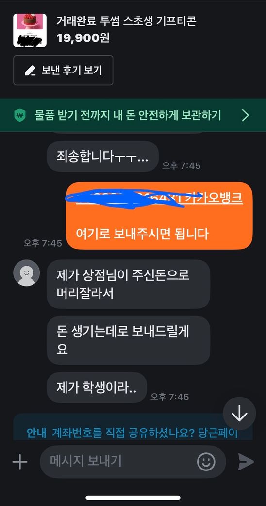 안녕하세요. 중고나라에서 투썸플레이스 기프티콘을 19,900원에 구매했습니다. 판매자와 채팅을 나눈 후 계좌이체로 돈을 보냈고, 기프티콘 이미지를 전달받았습니다.