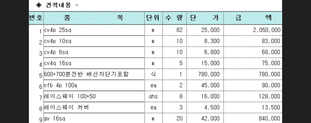 적혀 있는 cv4p 25sq, 10sq, 6sq 같은 건 말씀하신 대로 전선 규격이 맞고 단가도 크게 비싼 편은 아니라고 합니다 자재의 경우도 야간 저렴 하거나 보통 수준에 가까운 편입니다 다만 인건비가 따로 포함인지 그리고 600×700 분전반 차단기 포함이 어떤 브랜드 용량인지 확인은 꼭 하시기 바랍니다 같은 가격이라도 차단기 등급에 따라 품질 차이가 꽤 난다고 합니다 이정도 견적은 바가지 느낌은 아니고 일반적인 가격 견적이라고 보면 됩니다