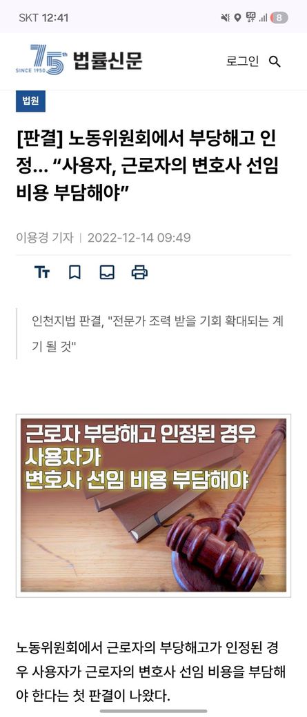 부당해고 인정 시 노동위원회 변호사비 줘야한다는 판결이 났습니다.