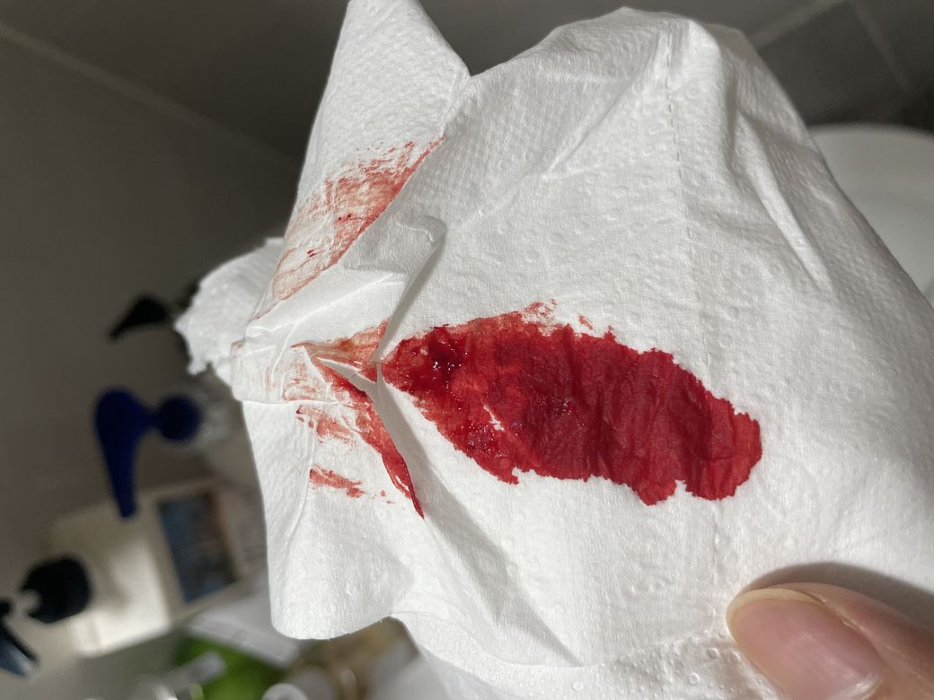 이때 항문에 자극이 자주 되는 것으로 보이며 치핵에서 출혈이 발생하는 것으로 보입니다.
