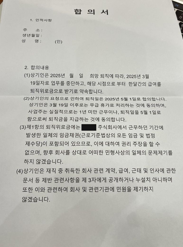 회사에서 사진과 같은 합의서를 제안받았습니다.