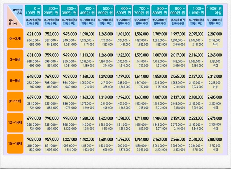 부부합산 세전소득 1000만원~1199만원 사이, 만6-8세, 만9-11세 적용시 약 213만원, 218만원이고 배우자가 최소30만원을 부담한다고 보면 183만원, 188만원이 산정되나 이는 절대적인 것이 아니므로 참고만 하시기 바랍니다.