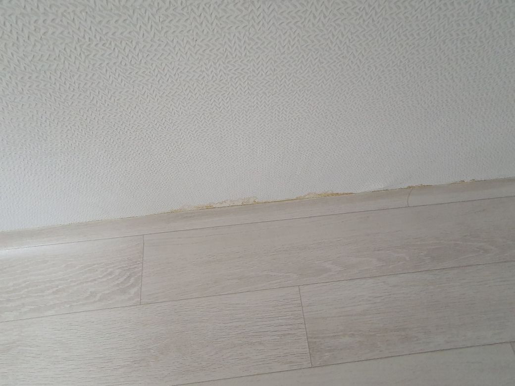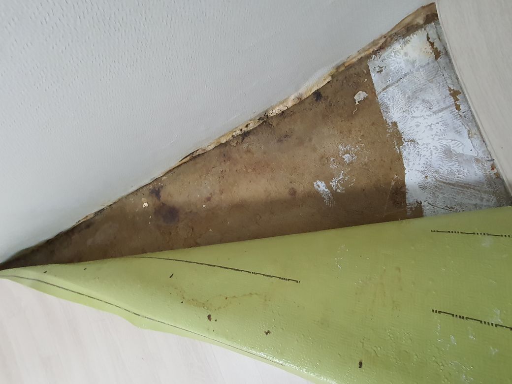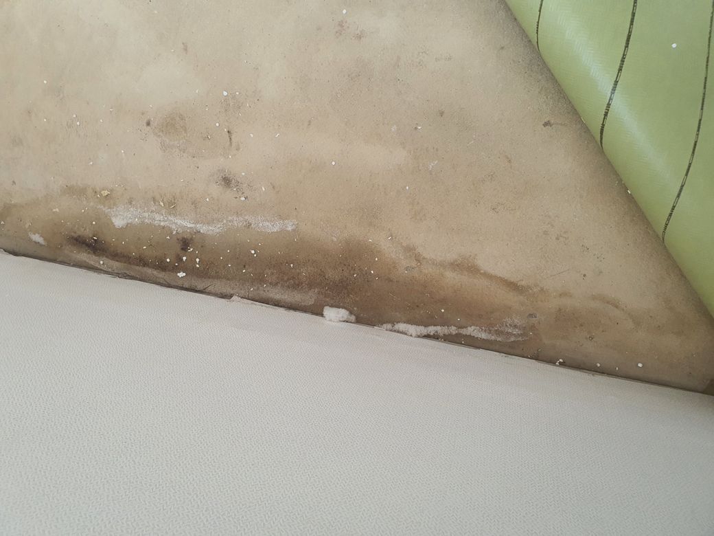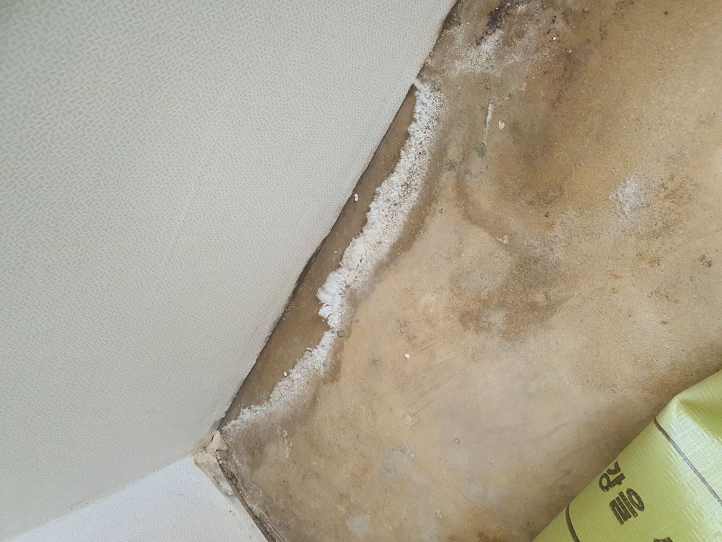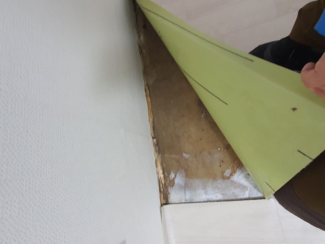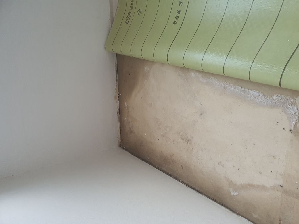 2. 1번방에 장판 및 걸레받이 쪽에 곰팡이 확인되어 들춰보니 바닥에 습기가 가득하고 곰팡이 확인