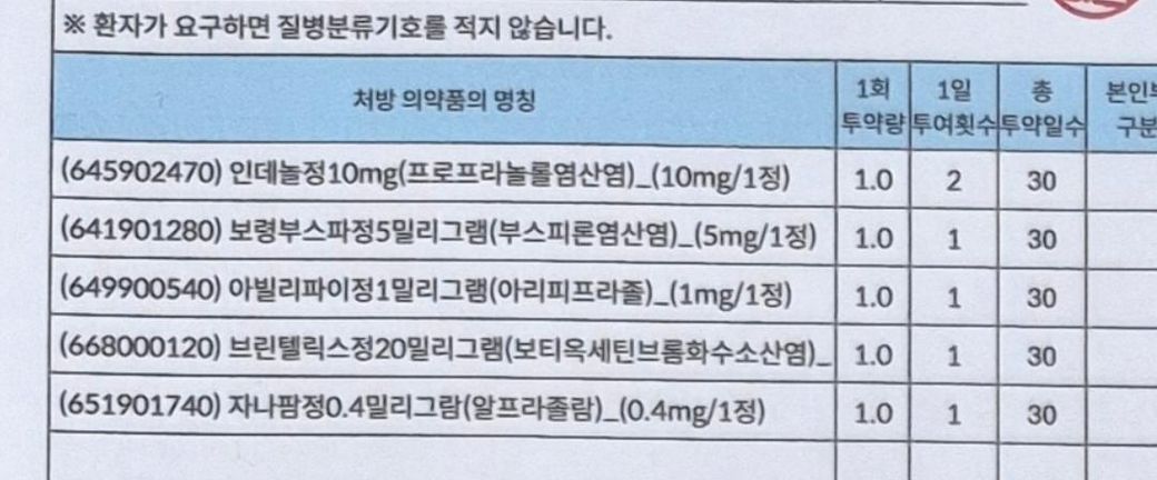 사진에 보이는 정신과 약은 인데놀정 10mg(프로프라놀롤), 보령부스파정 5mg(부스피론), 아빌리파이정 1mg(아리피프라졸), 브린텔릭스정 20mg(보티옥세틴), 자나팜정 0.4mg(알프라졸람)으로 확인됩니다.