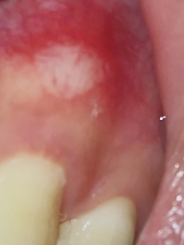 단순 구내염의 양상은 아닙니다. 다만, 악성 병소의 양상도 아니니 너무 걱정 마시고 구강내과 한번 가보시기 바랍니다.